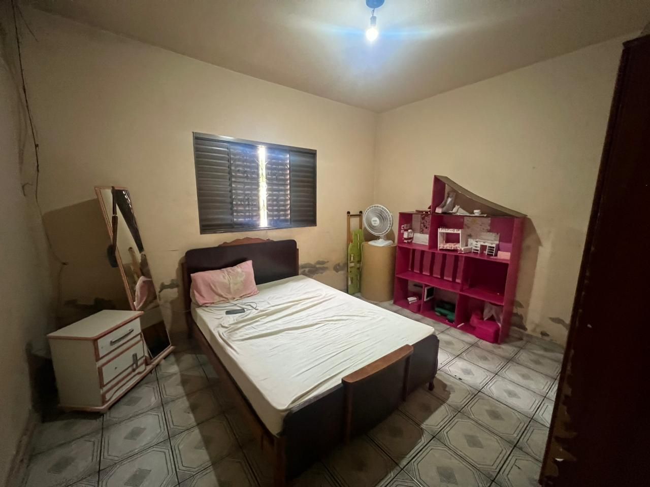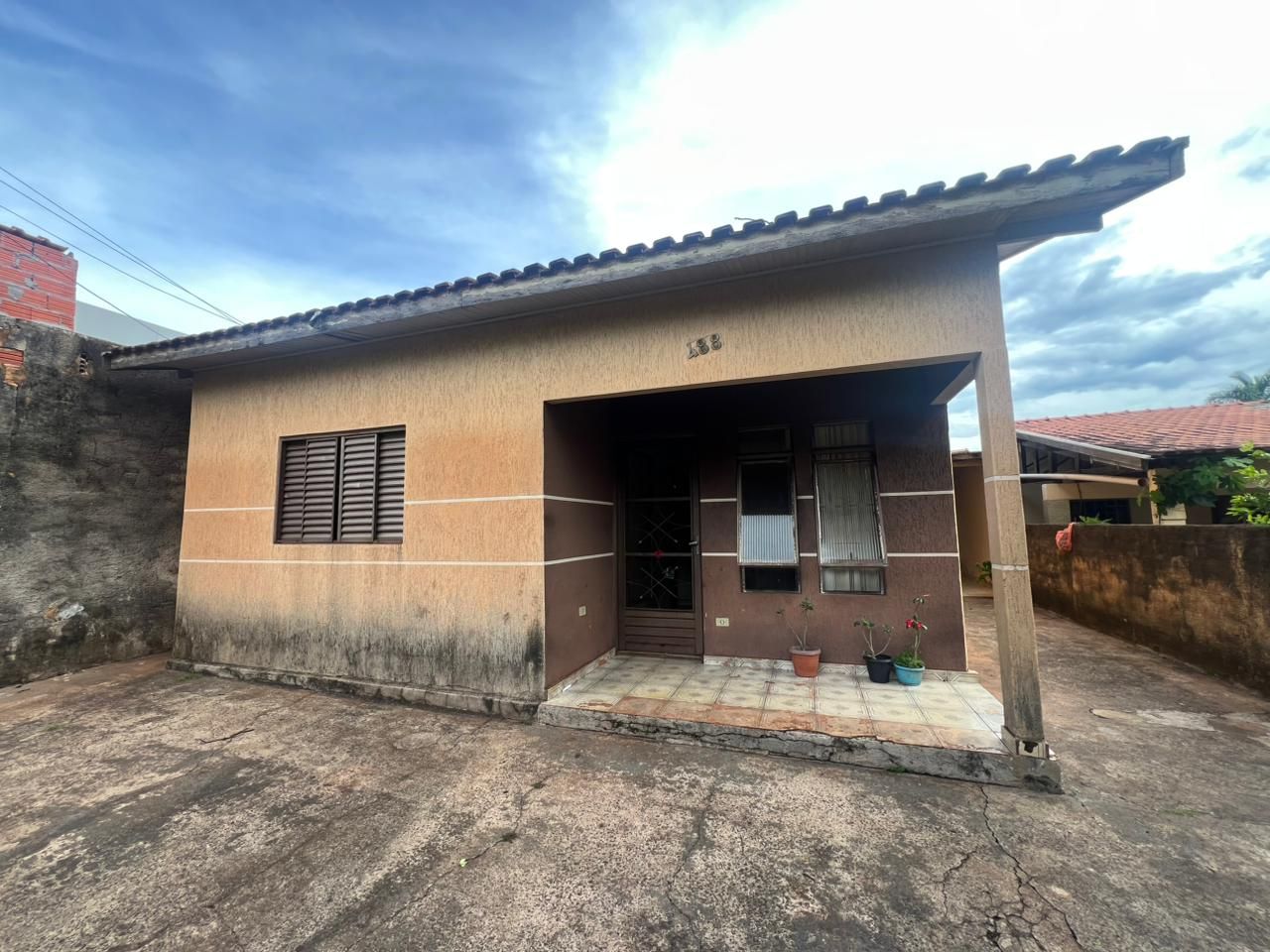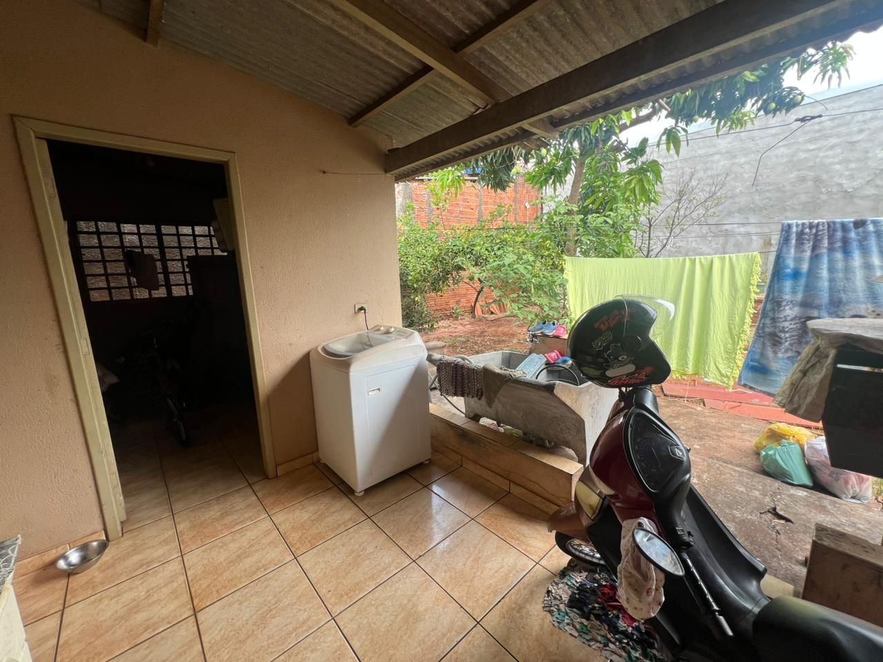 Sala, cozinha, três quartos, banheiro social, lavanderia, terreno nos fundos, e garagem descoberta.