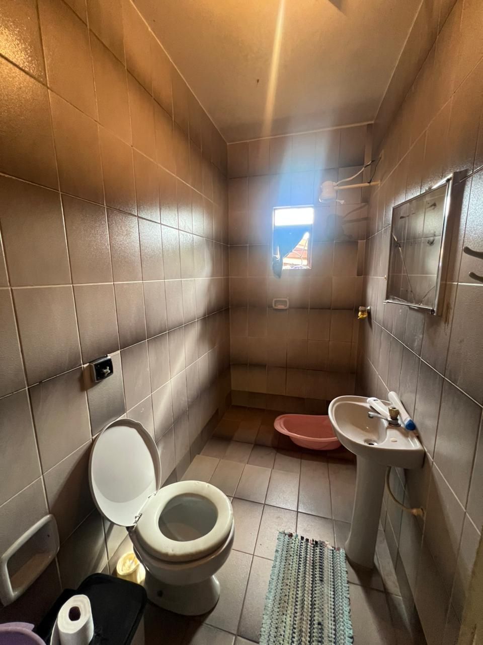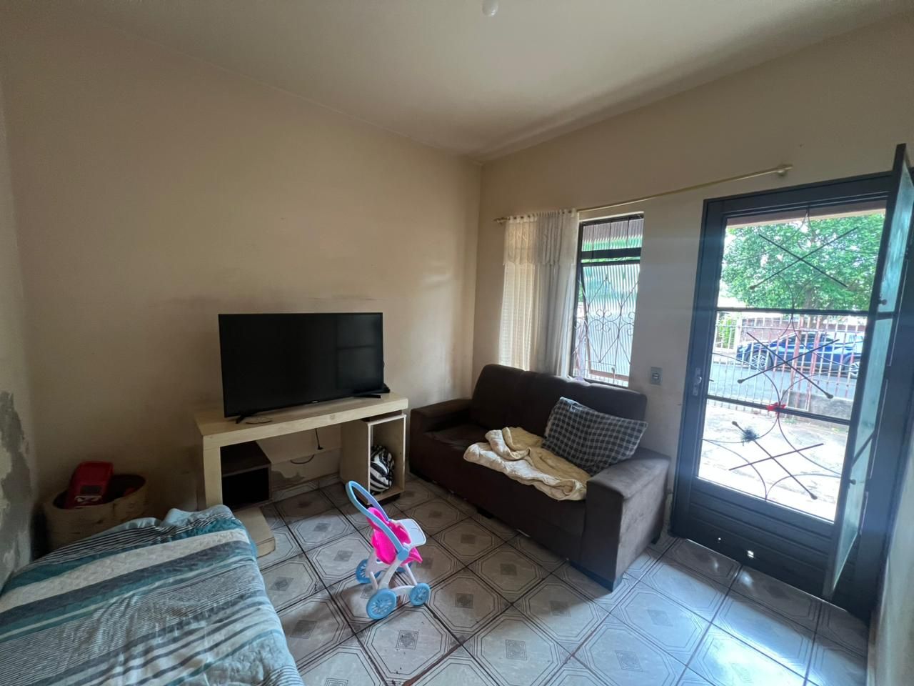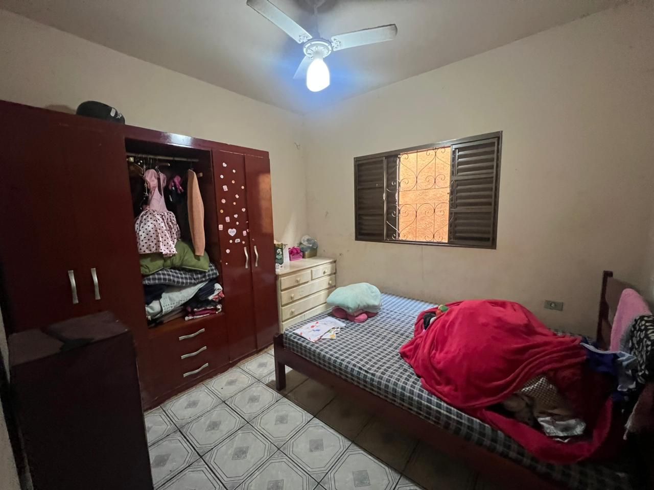 Sala, cozinha, três quartos, banheiro social, lavanderia, terreno nos fundos, e garagem descoberta.