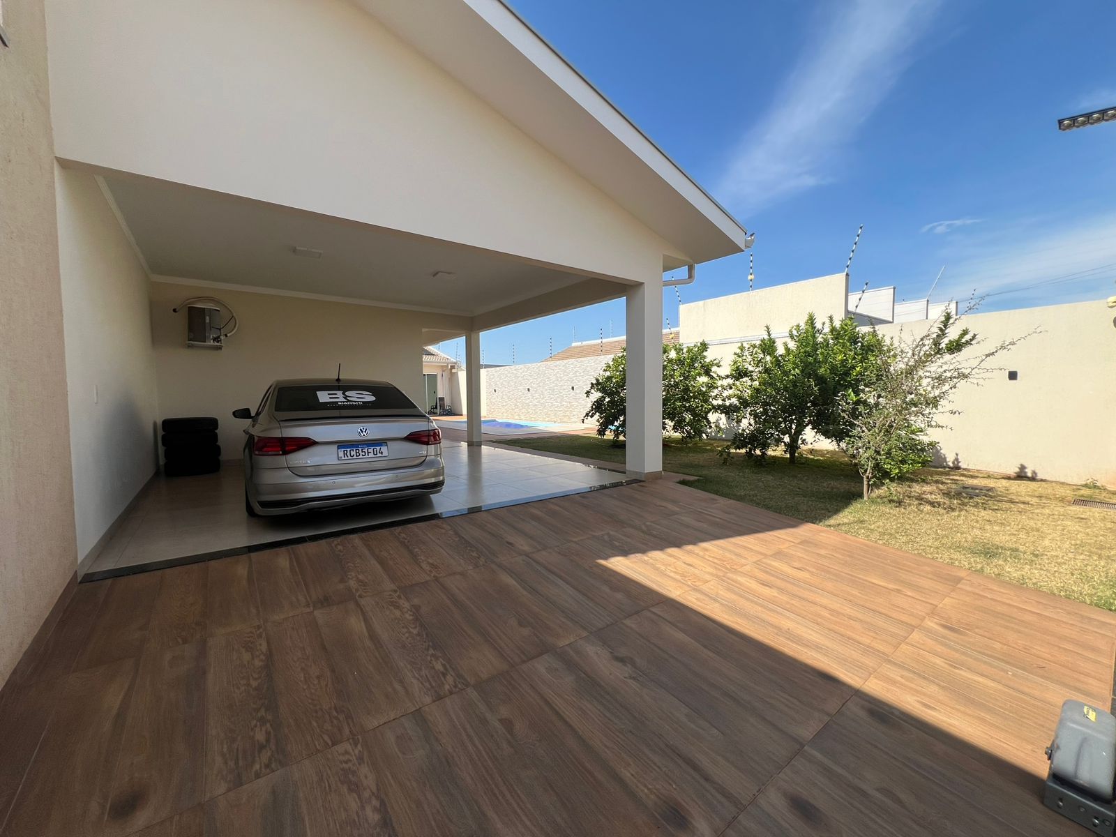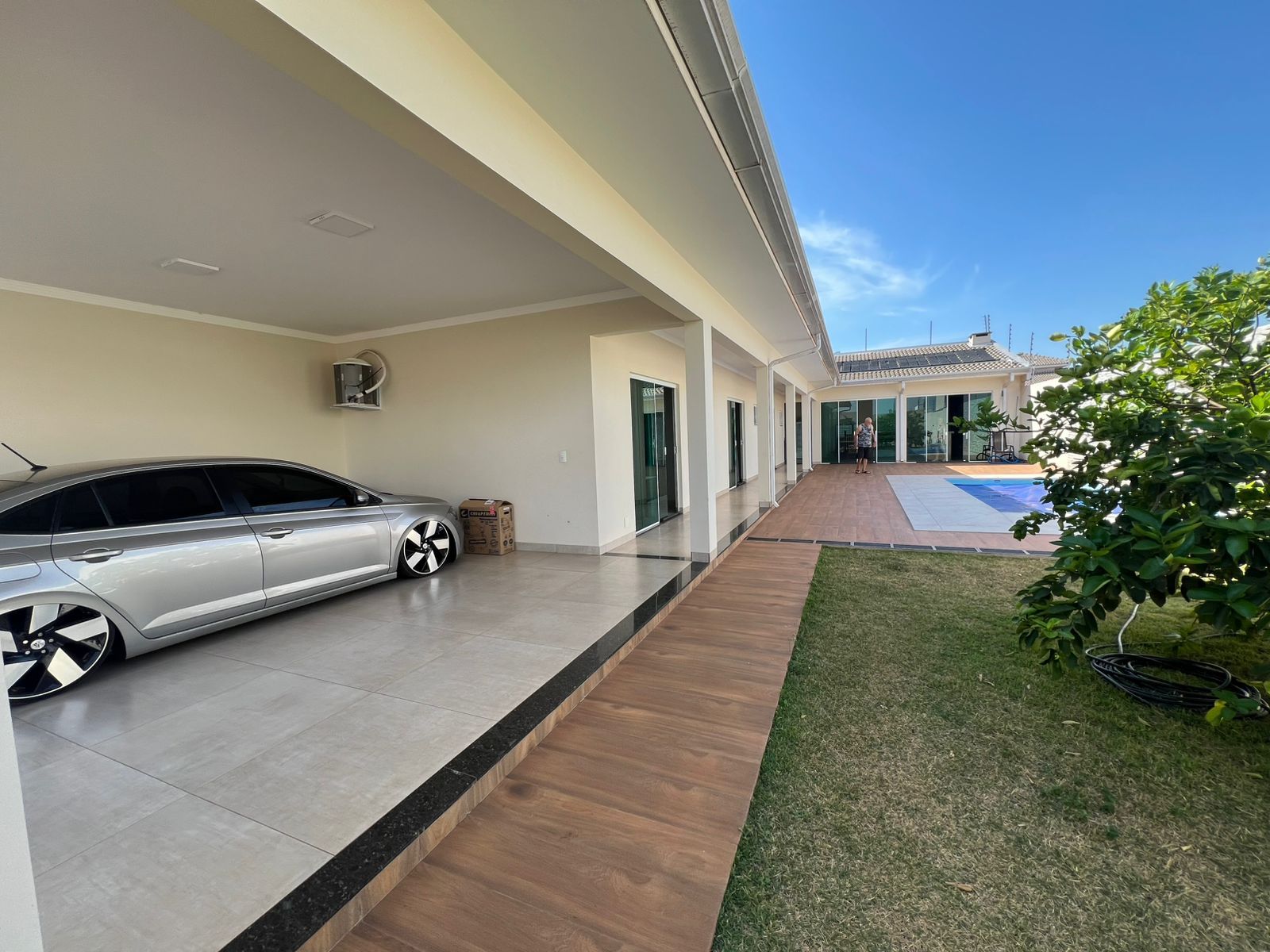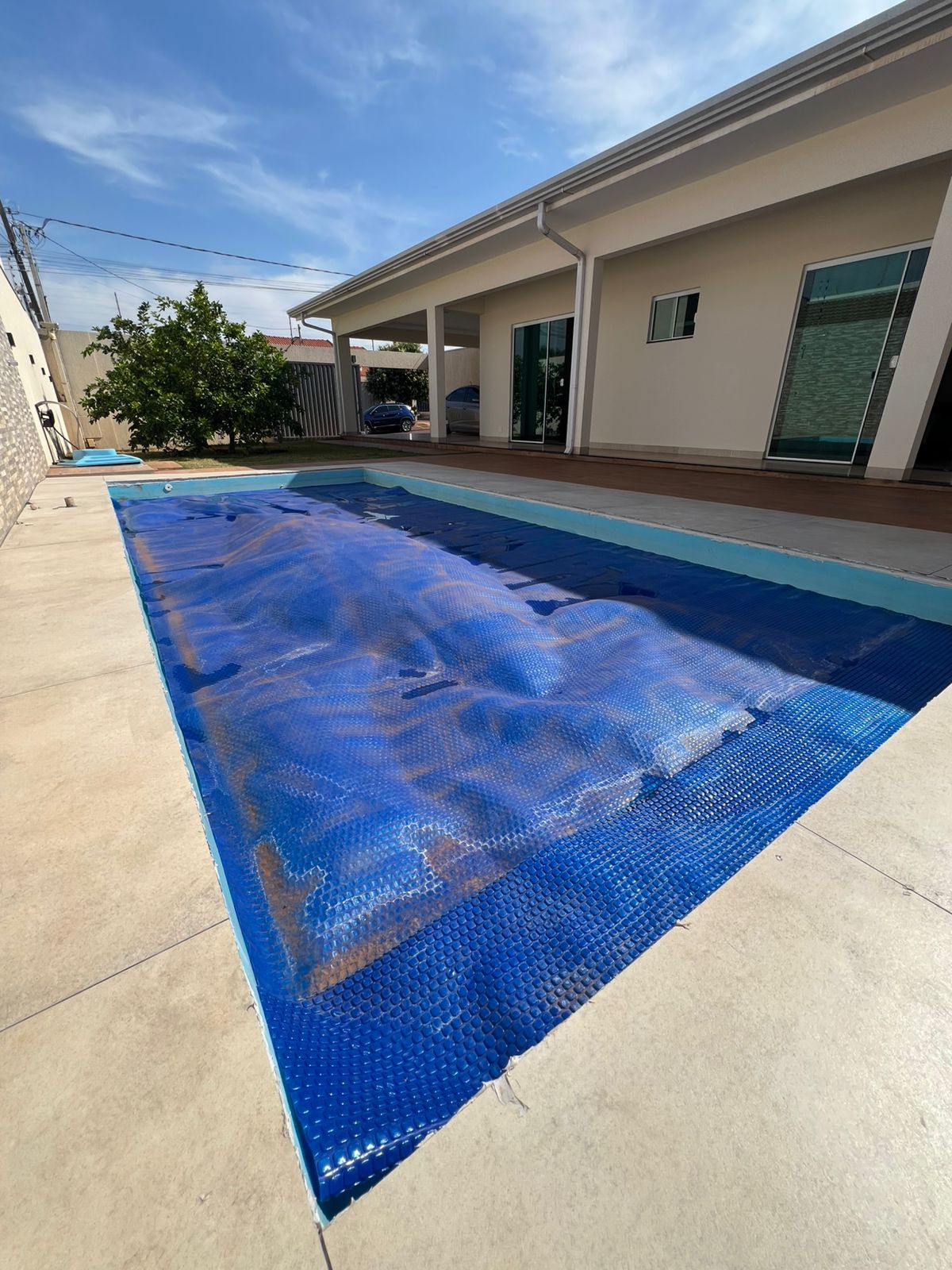 Casa com garagem ampla, piscina, três suítes, com área gourmet planejada grande e dois banheiros sociais externos.