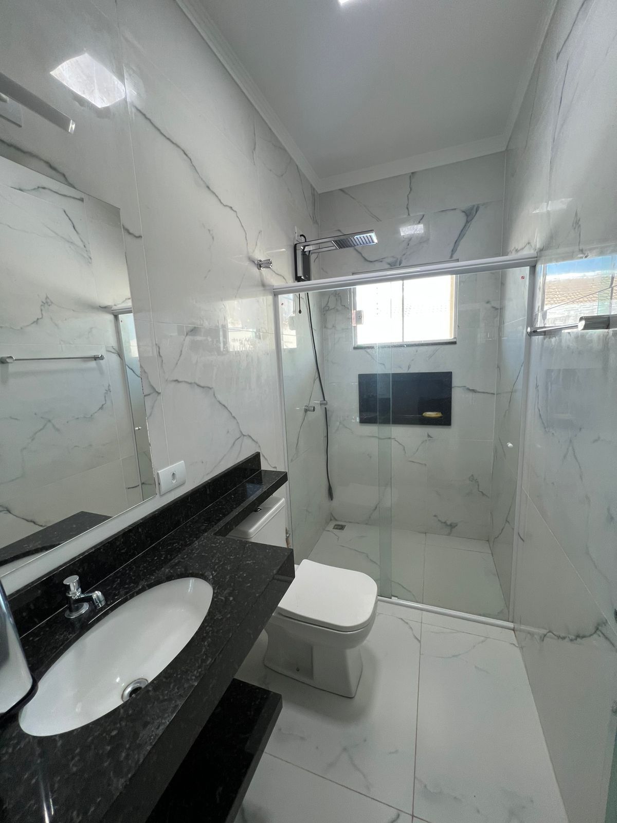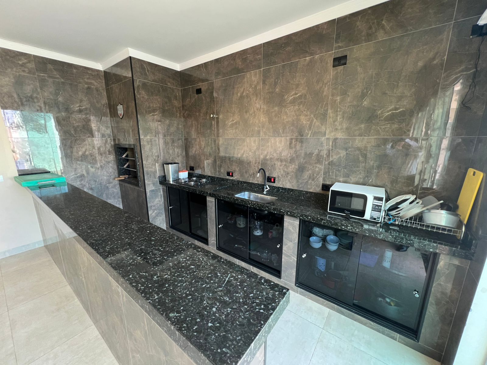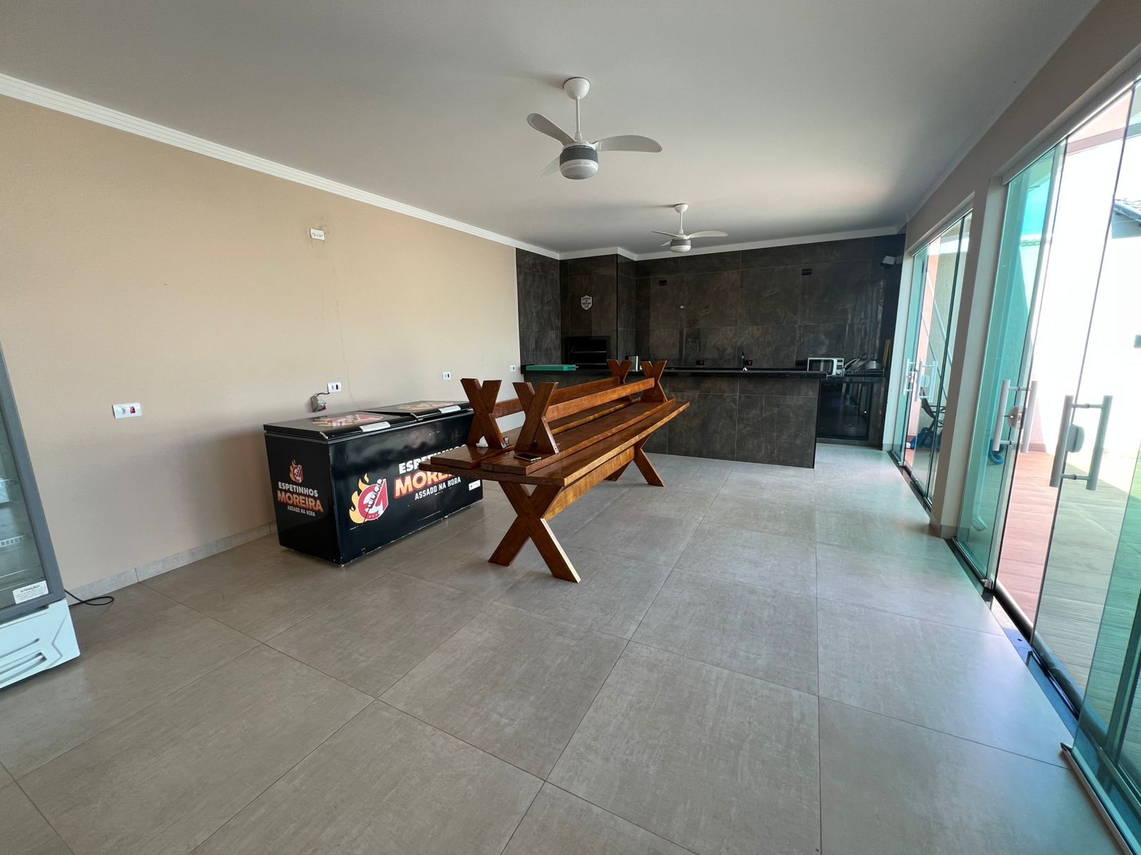 Casa com garagem ampla, piscina, três suítes, com área gourmet planejada grande e dois banheiros sociais externos.
